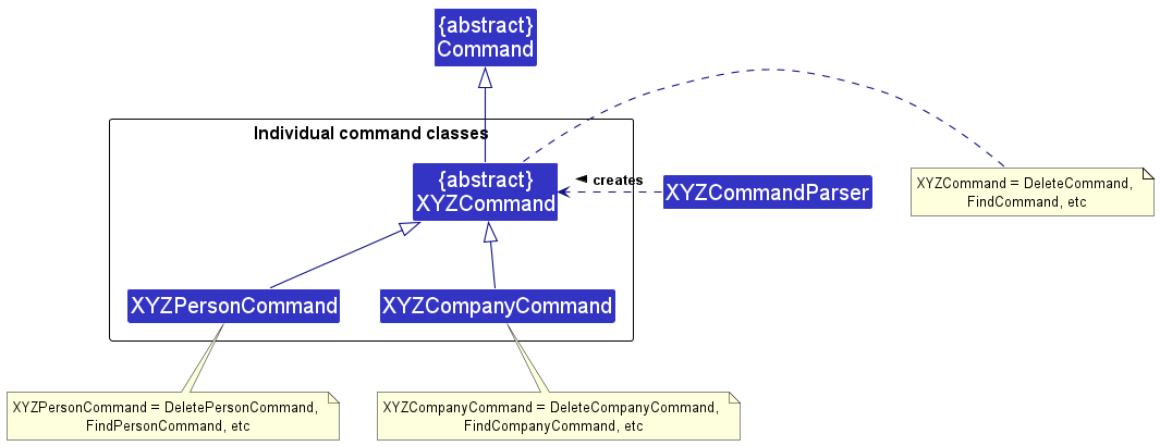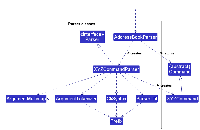 XYZCommandParserclasses (e.g.,AddCommandParser,DeleteCommandParser, …) inherit from theParserinterface so that they can be treated similarly where possible e.g, during testing.